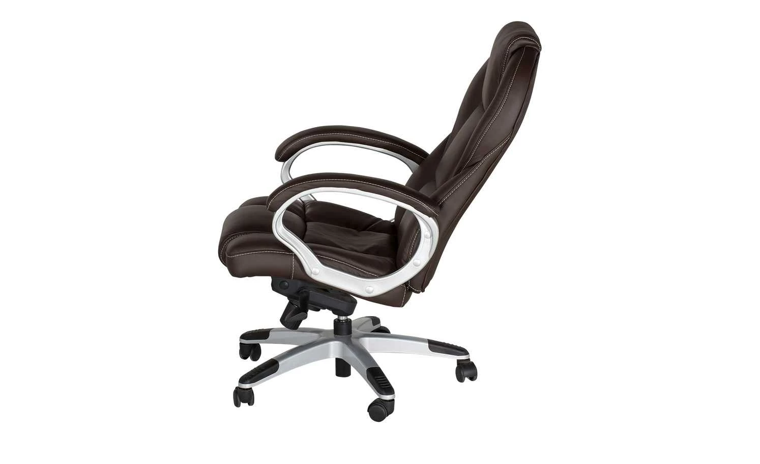 Die gepolsterte Rückenlehne des mit braunem Kunstleder bezogenen Chefsessels verträgt ein breites Kreuz. Der Sessel der XXL- Klasse steckt ein Körpergewicht von bis zu 150 kg weg und überzeugt durch seine Robustheit bei gleichzeitiger Funktionalität. Mit seinen gepolsterten Armlehnen, ergonomischer Sitz- und Rückenpolsterung sowie stufenloser Höhenverstellung mittels TÜV- Gaslift lässt er entspanntes, ermüdungsfreies Arbeiten zu. Silberfarbene Armlehnen und Nylonfußkreuz geben diesem Chefsessel eine leichtere Wirkung.