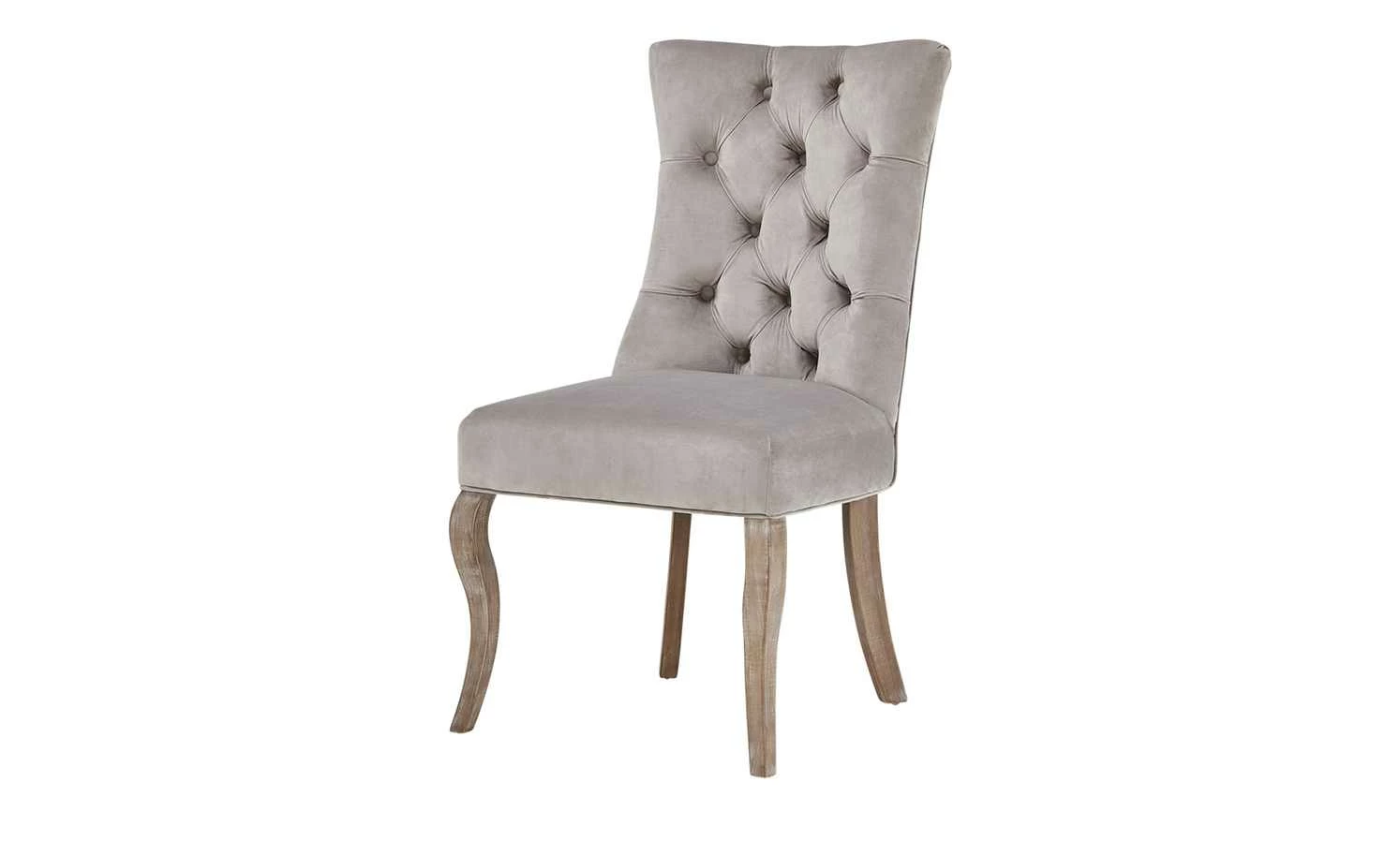 Mit dem Polsterstuhl Felicita zieht ein angesagtes It-Piece bei Ihnen ein. Der Stuhl ist Teil von Höffners erster exklusiver Bloggerkollektion, die in Zusammenarbeit mit der erfolgreichen Influencerin Cita Maass entwickelt worden ist. Felicita hat einen glamourösen Vintage-Look. Vor allem die Steppung im Chesterfield-Stil ist ein Eyecatcher. Sitz und Rücken sind mit einem grauen Samtstoff bezogen. Der feine Glanz lässt die Bezugsfarbe noch edler wirken. Die vier geschwungenen Stuhlbeine sind aus massivem Gummibaum gefertigt. Auf der Rückseite der Lehne befindet sich ein Hängegriff aus Metall, der als Deko dient und beim Hervorziehen des Stuhls hilft.