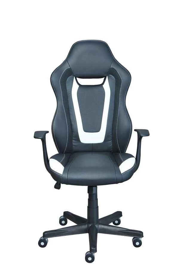 Bei diesem Drehstuhl trifft sportliches Design auf Ergonomie. Der schwarze Kunstlederbezug wird durch weiße Highlights akzentuiert und betont das Design gekonnt. Der dick gepolsterte, ergonomische Stuhl ist drehbar und mit verschiedenen Verstellmöglichkeiten ausgestattet. So bietet er den nötigen Komfort für lange Arbeitstage oder Gaming-Sessions.