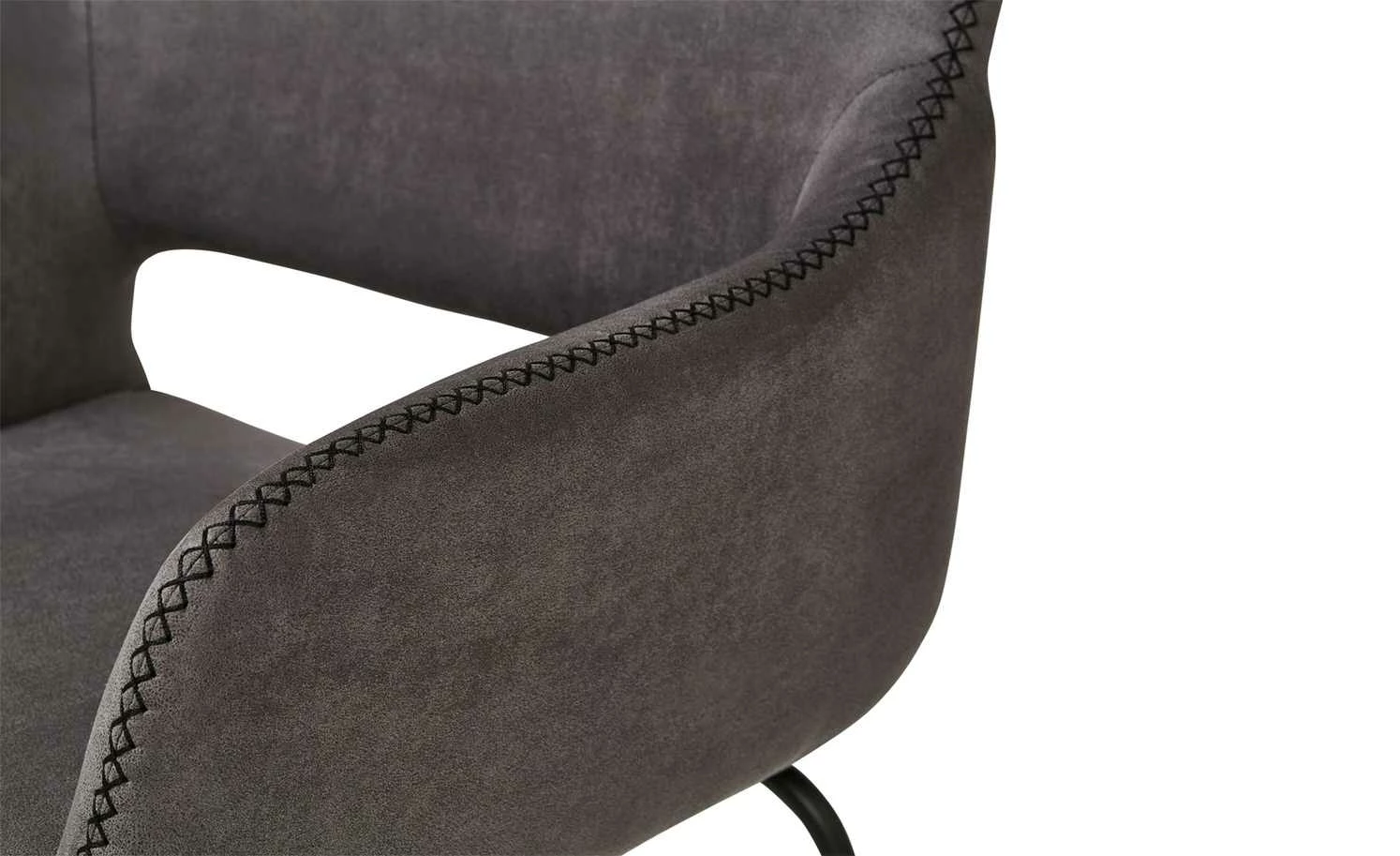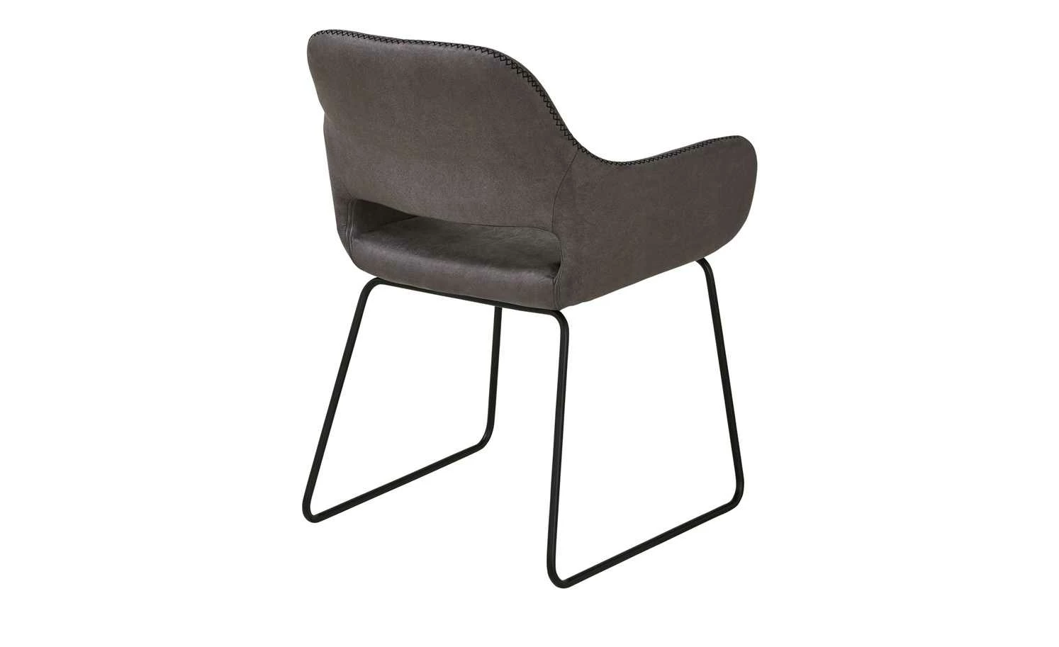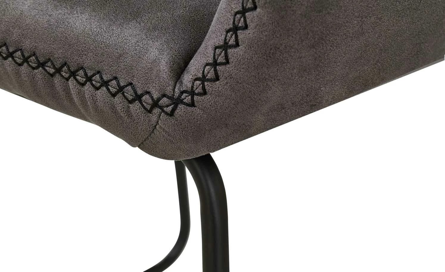 Ob am Esstisch oder so als Sitzgelegenheit – der Kufenstuhl Till macht eine stylische Figur. Und bequem ist er dabei auch noch. Die Sitzschale hat eine halbhohe Rückenlehne und zwei Armlehnen. Die gesamte Sitzschale ist zudem weich gepolstert, damit Sie es beim Sitzen gemütlich haben. Der Bezug besteht aus softer, grauer Mikrofaser. Das Besondere daran: Sie hat eine leichte Lederoptik. Auffällige Ziernähte unterstützen das Gesamtdesign. Ebenso wie die schwarzen Metallkufen.