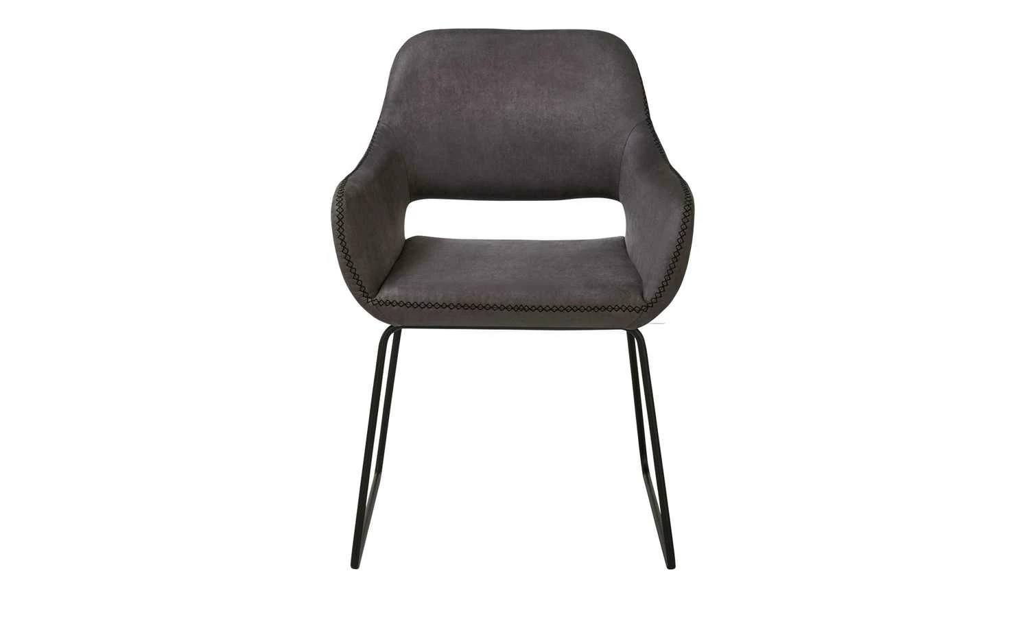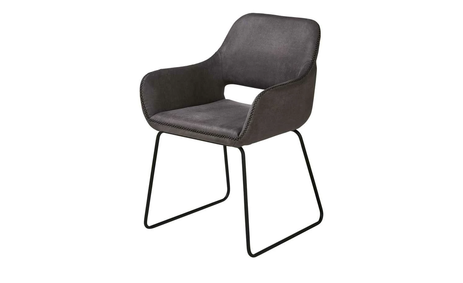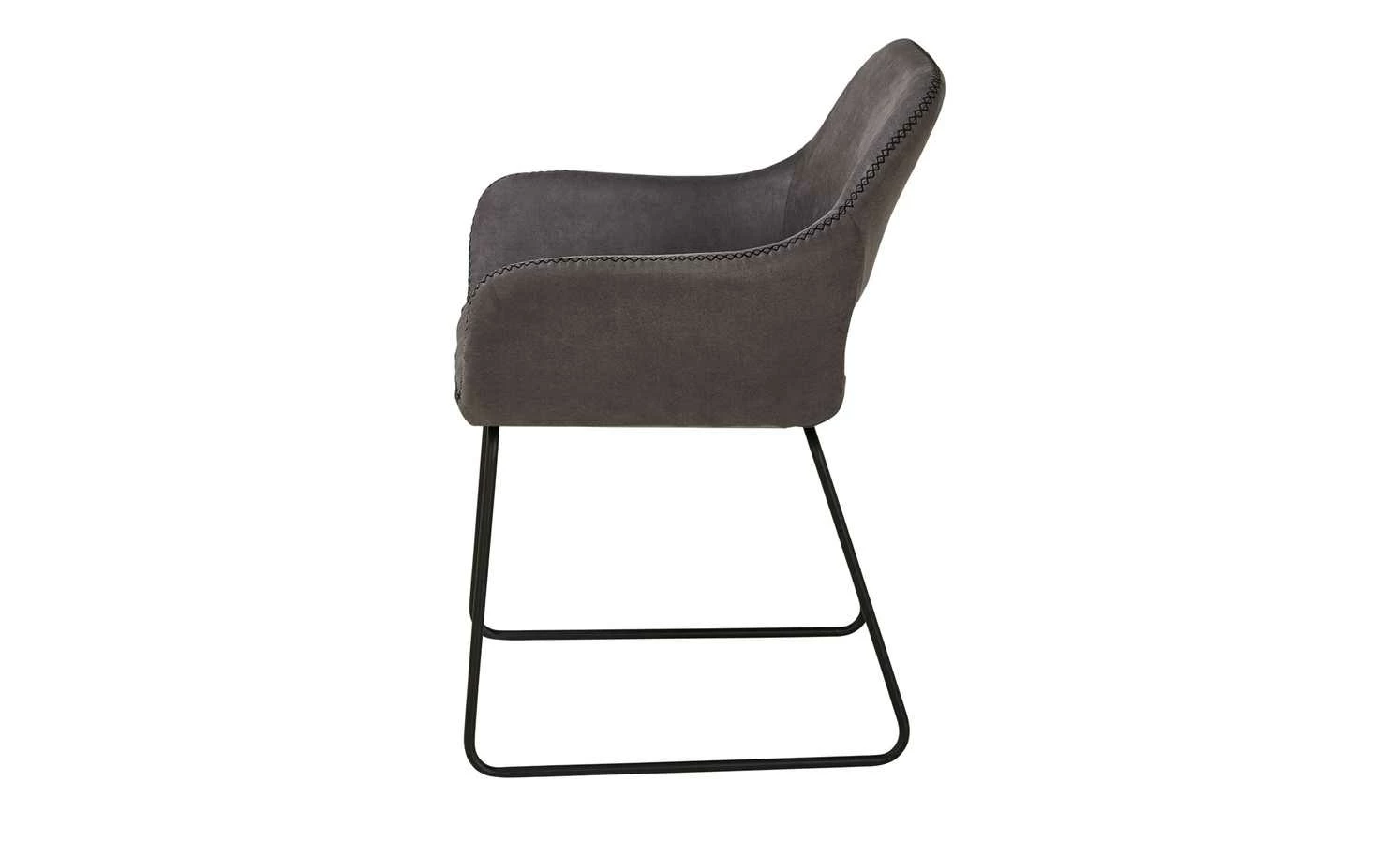 Ob am Esstisch oder so als Sitzgelegenheit – der Kufenstuhl Till macht eine stylische Figur. Und bequem ist er dabei auch noch. Die Sitzschale hat eine halbhohe Rückenlehne und zwei Armlehnen. Die gesamte Sitzschale ist zudem weich gepolstert, damit Sie es beim Sitzen gemütlich haben. Der Bezug besteht aus softer, grauer Mikrofaser. Das Besondere daran: Sie hat eine leichte Lederoptik. Auffällige Ziernähte unterstützen das Gesamtdesign. Ebenso wie die schwarzen Metallkufen.
