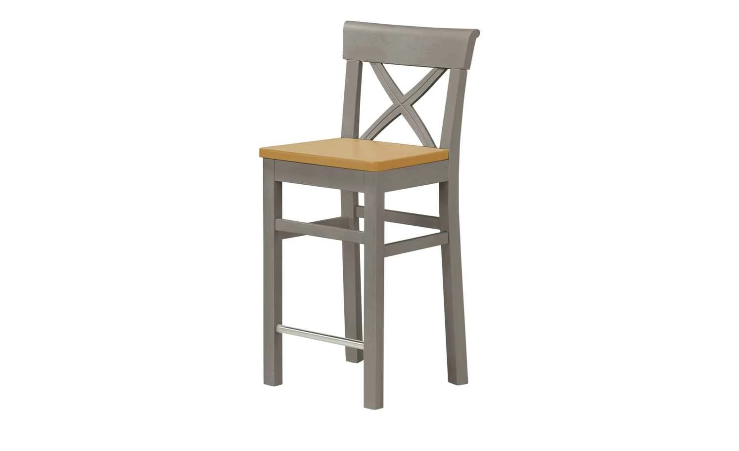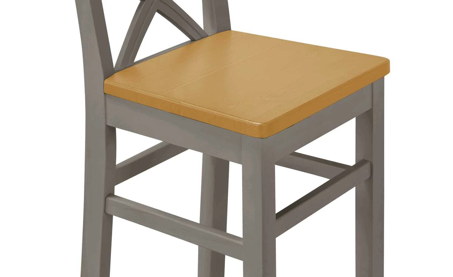 Florian ist die ideale Sitzgelegenheit für Tresen- und Bartische. Der Stuhl aus massiver Kiefer hat eine erhöhte Sitzfläche. Sie setzt sich farblich vom weißen Gestell und Rücken ab. Florian ist im Landhausstil gehalten – passend zu den anderen Möbeln der Serie.