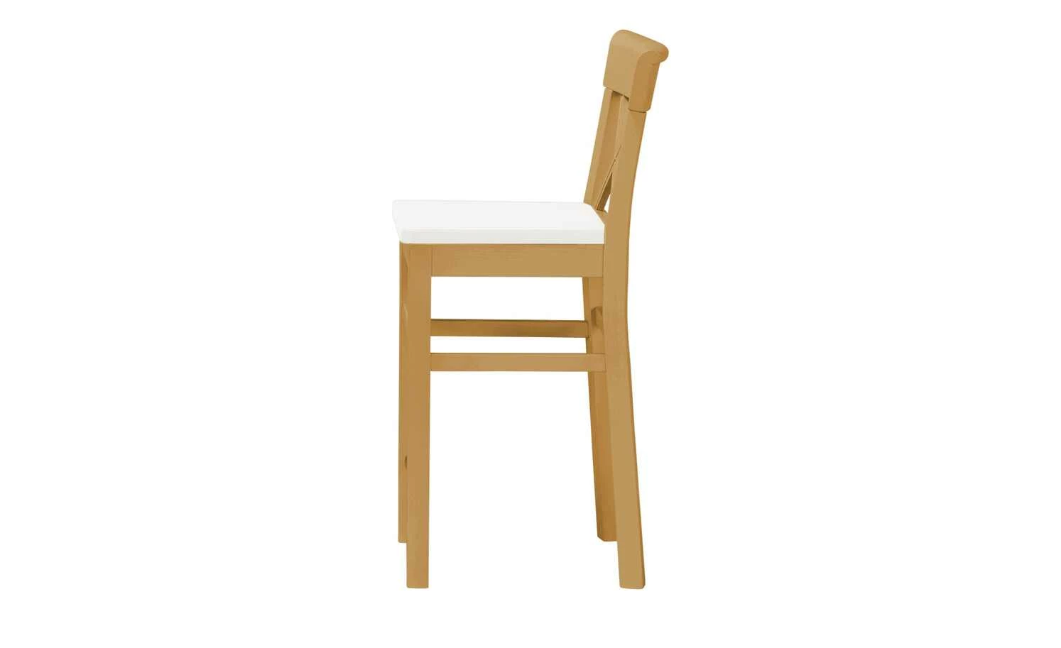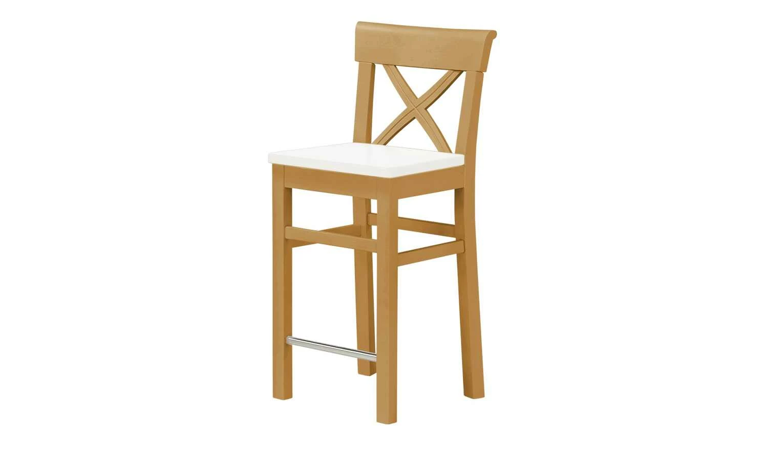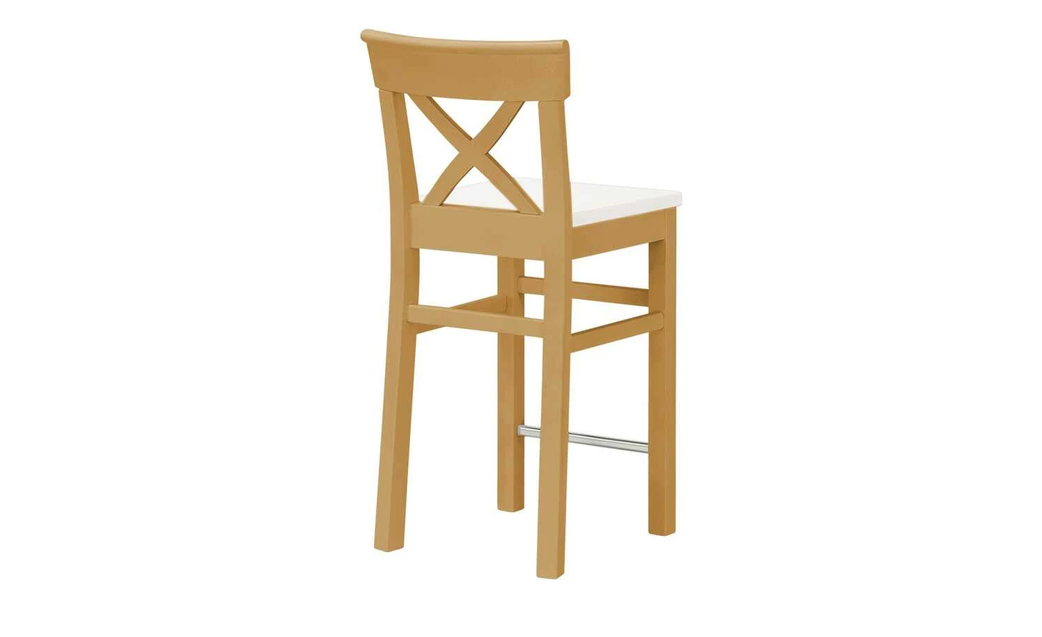 Florian ist die ideale Sitzgelegenheit für Tresen- und Bartische. Der Stuhl aus massiver Kiefer hat eine erhöhte Sitzfläche. Sie setzt sich farblich vom weißen Gestell und Rücken ab. Florian ist im Landhausstil gehalten – passend zu den anderen Möbeln der Serie.