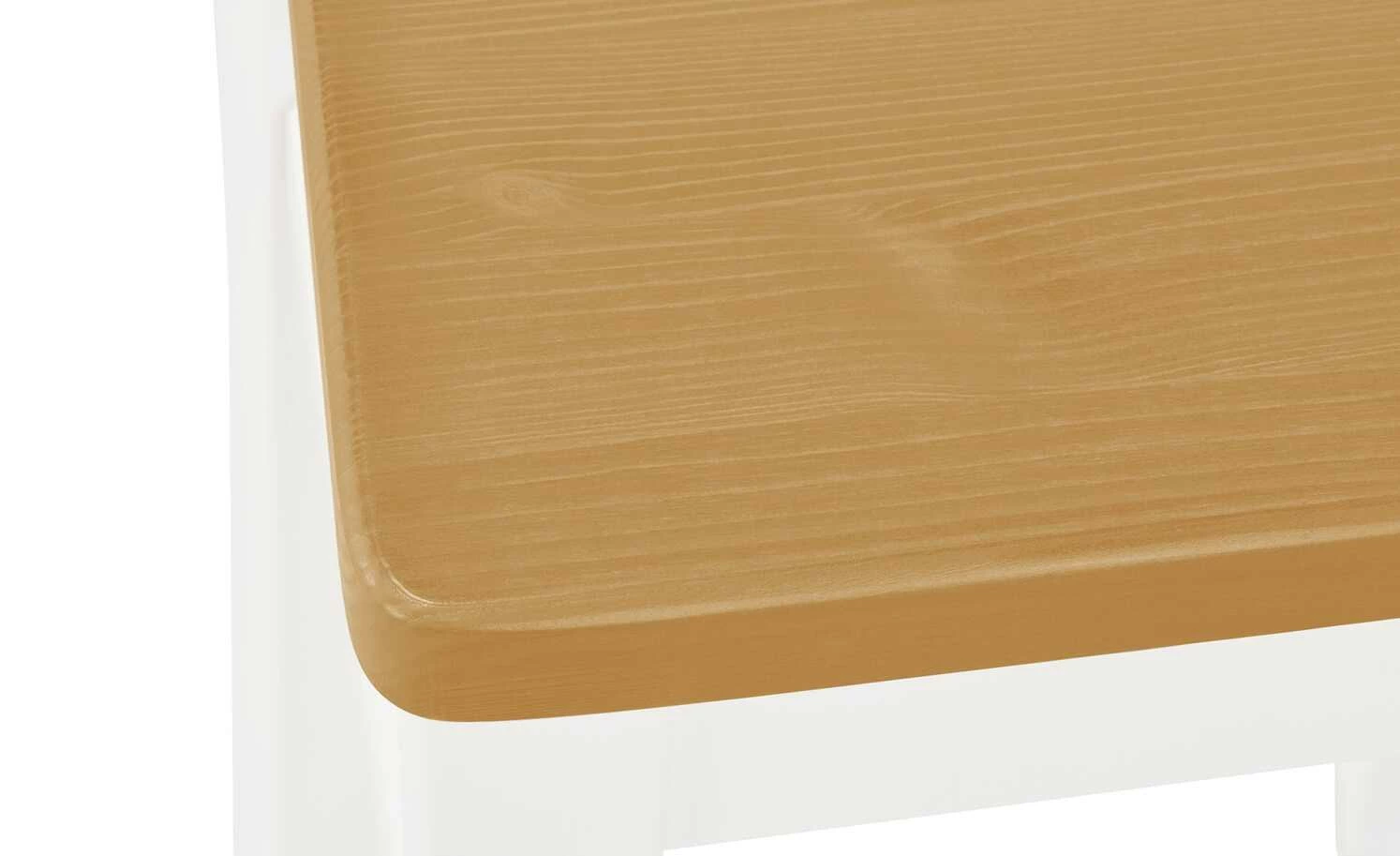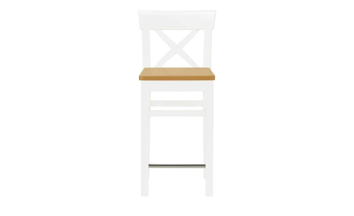 Florian ist die ideale Sitzgelegenheit für Tresen- und Bartische. Der Stuhl aus massiver Kiefer hat eine erhöhte Sitzfläche. Sie setzt sich farblich vom weißen Gestell und Rücken ab. Florian ist im Landhausstil gehalten – passend zu den anderen Möbeln der Serie.
