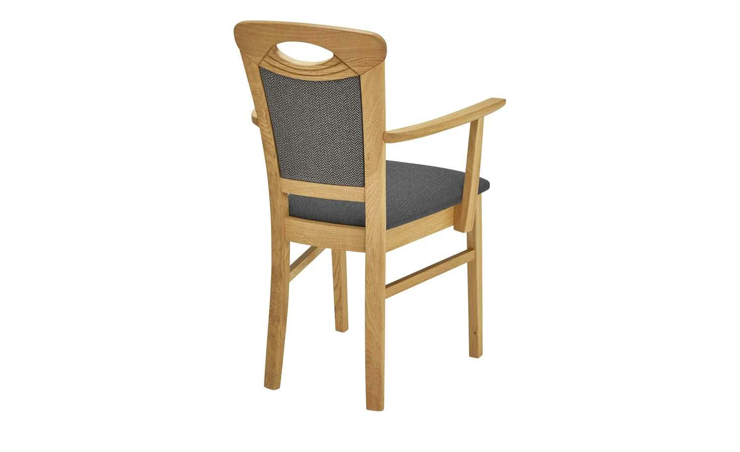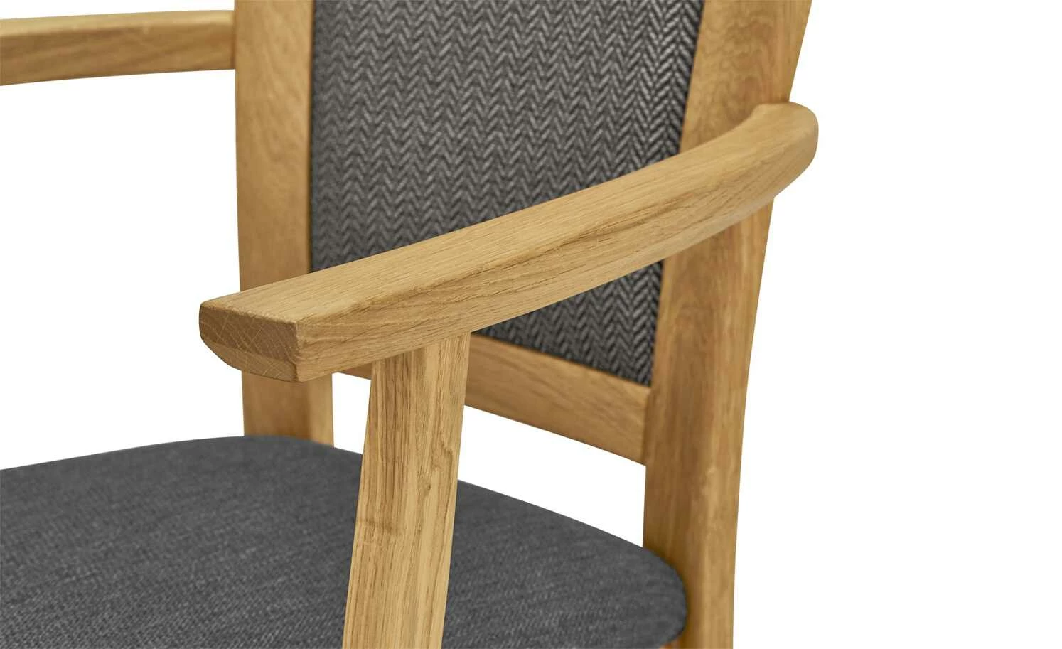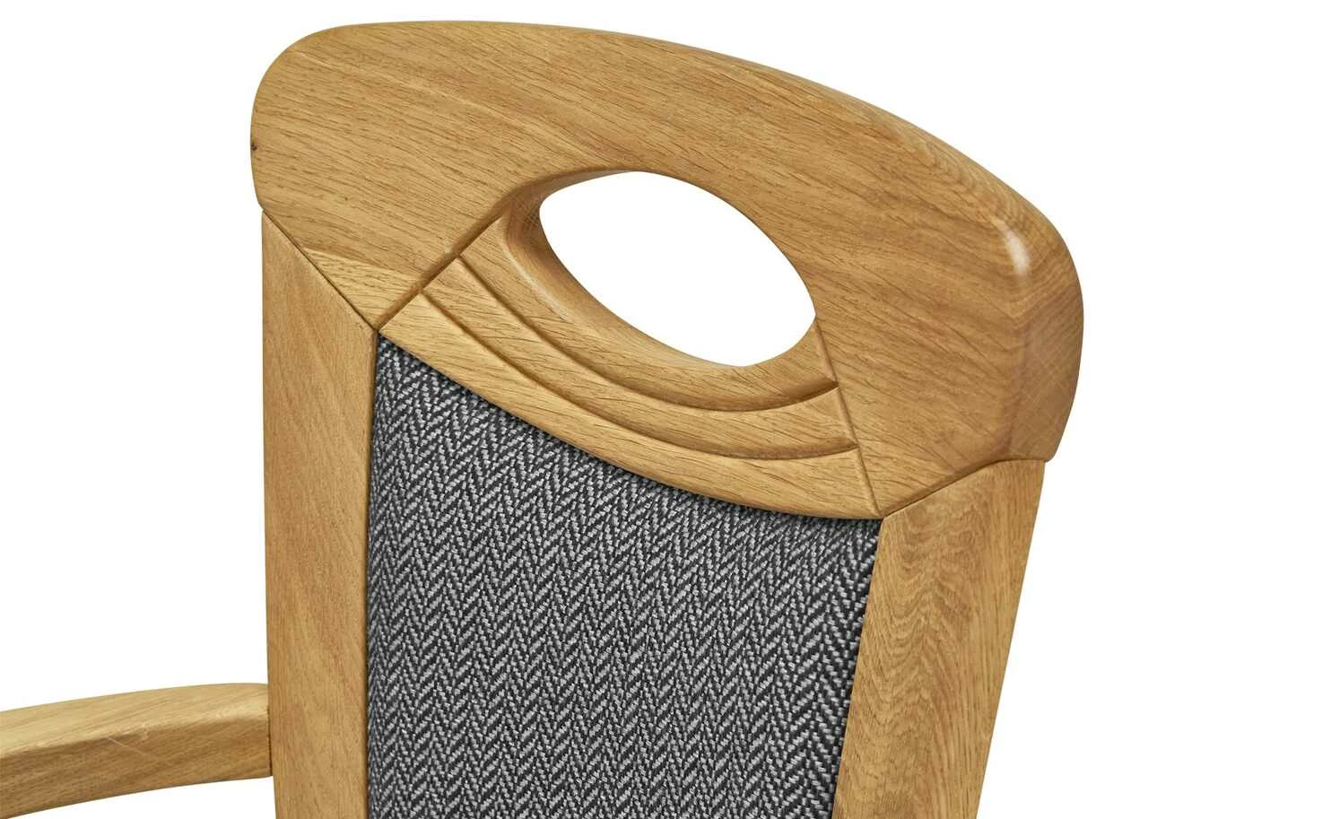 Der Polsterstuhl Multistar verfügt über ein klassisches, elegantes Design. Wahlweise verfügt der Stuhl über Armlehnen. Die hohe Rückenlehne ist am oberen Ende mit einem Griff ausgestattet. Multistar ist aus massiver Eiche gefertigt, die mit einem Öl behandelt worden ist. Sitzfläche und Teile der Rückenlehne sind weich gepolstert und mit Webstoff bezogen.