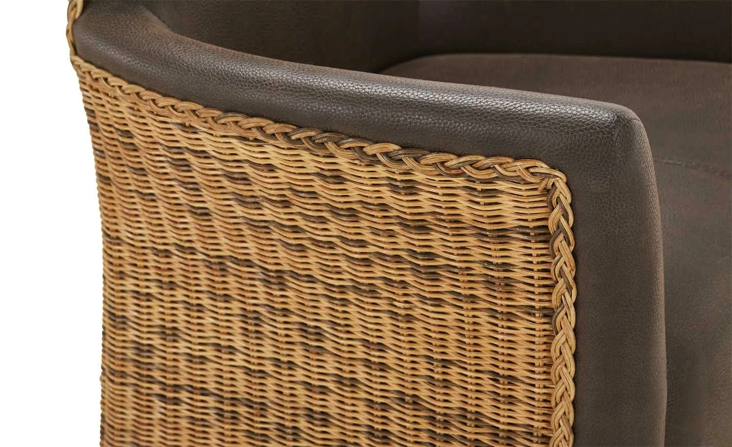 Mit seiner besonderen, mediterranen Optik ist der Stuhl Antonio eine Bereicherung für den Essbereich. Die Rückseite und die Seiten der beiden Armlehnen sind mit einem attraktiven Rattangeflecht versehen. Der Sitzbereich, die Vorderseite der Lehne und Armlehnen sind mit Kunstleder bezogen. Der dunkle braune Farbton setzt sich schön vom Naturton des Rattans ab. Eine weiche Polsterung sorgt für ein angenehmes Sitzgefühl.