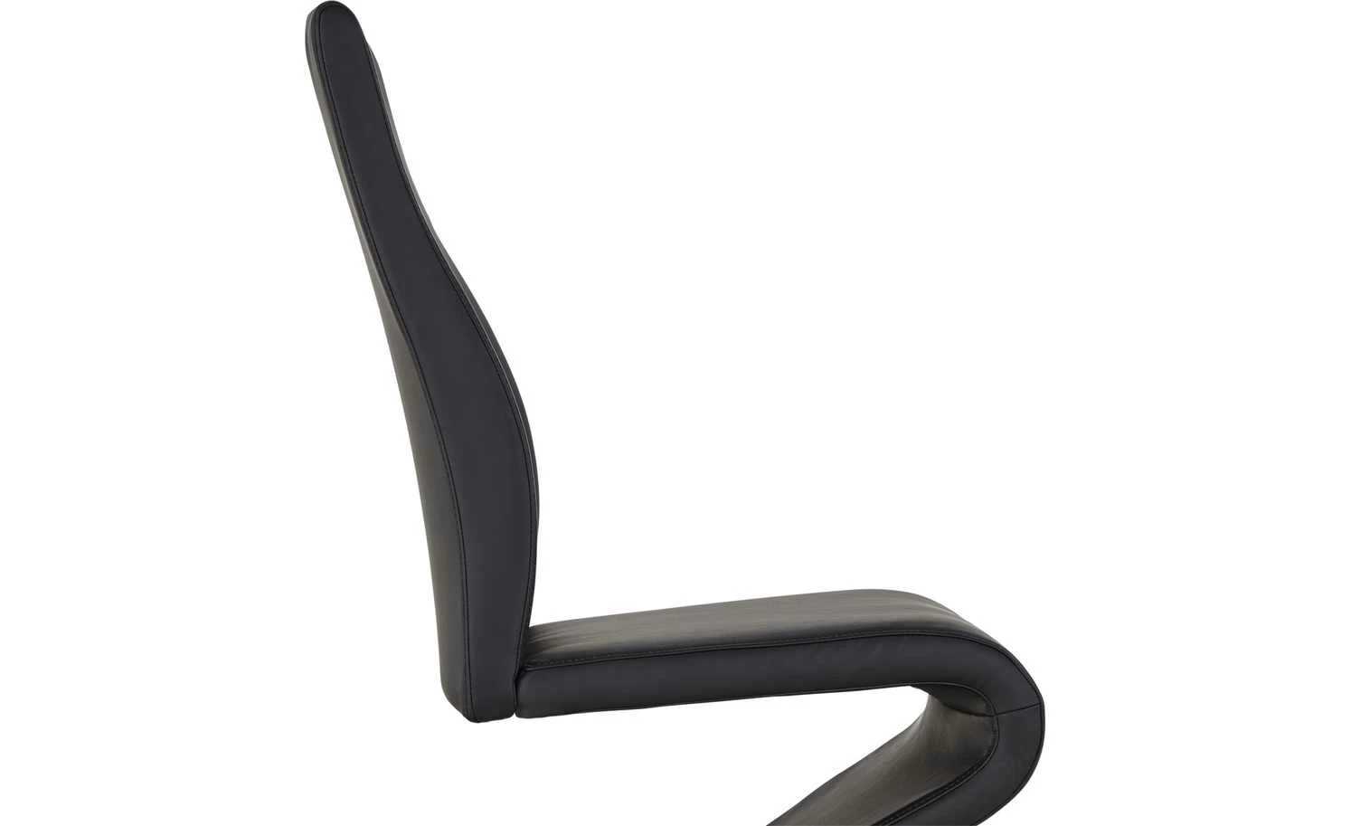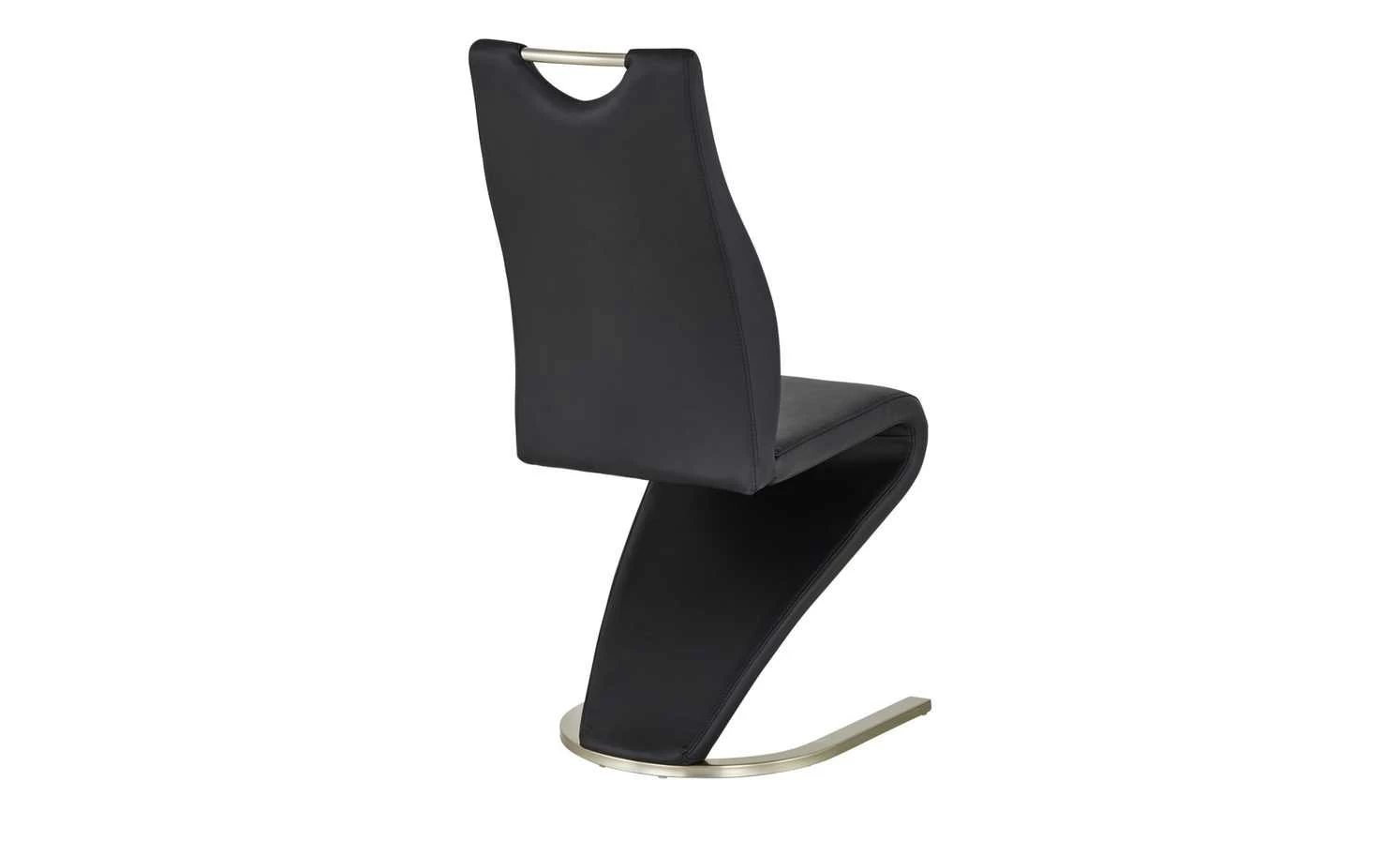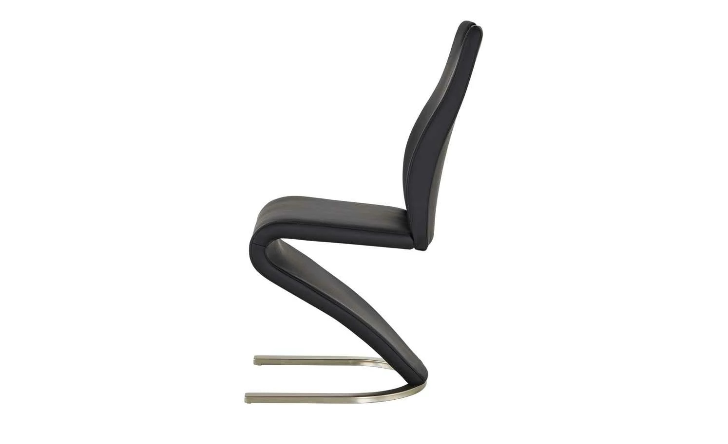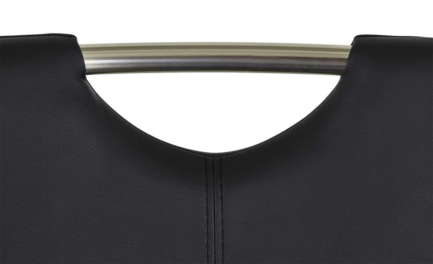 Für Fans extravaganter Designs empfiehlt sich der Schwingstuhl Danilo. Er ist ein tolles Highlights für Ihren Essbereich. Gleichzeitig ist der Stuhl auch richtig bequem. Zum einen schwingt er leicht, zum anderen ist er weich gepolstert. Die hohe vorgeformte Rückenlehne verfügt am oberen Ende über einen praktischen Griff. Rücken, Sitz und das Gestell sind mit schwarzem Kunstleder bezogen. Einzig der Fuß in U-Form und der Griff setzen sich in Edelstahloptik ab.