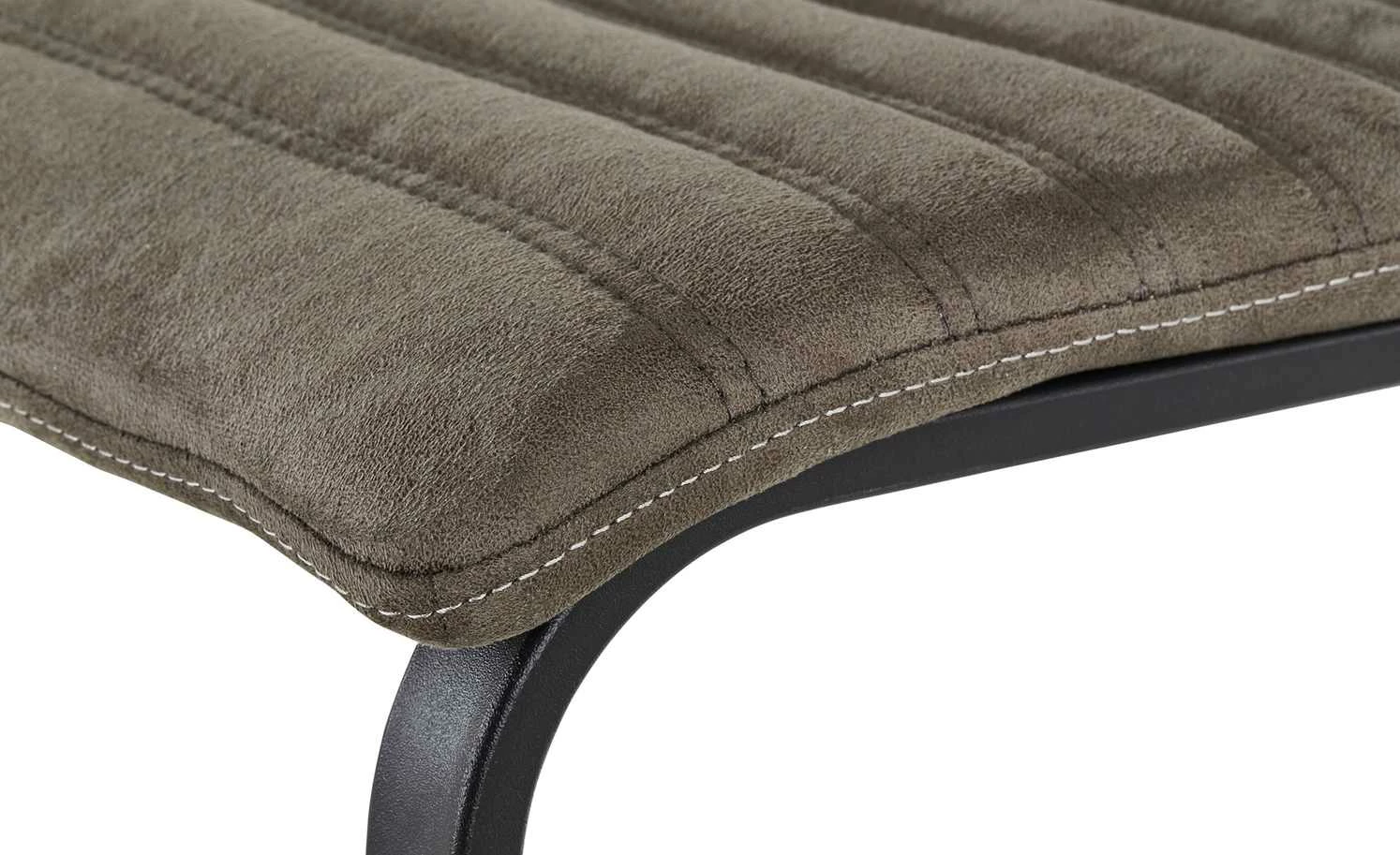 Zurückhaltend und zugleich modern sieht der Schwingstuhl Hubertus aus. Sitz und Rückenlehne sind einheitlich mit einem graubraunen Stoff bezogen. Er ist auf der Vorderseite horizontal gesteppt. Das Schwingstell setzt sich in dezentem Schwarz ab. Es besteht aus Metall und hat eine pulverbeschichtete Oberfläche. Für Komfort sorgt nicht nur das federnde Sitzgefühl, sondern auch die weiche Schaumstoffpolsterung.