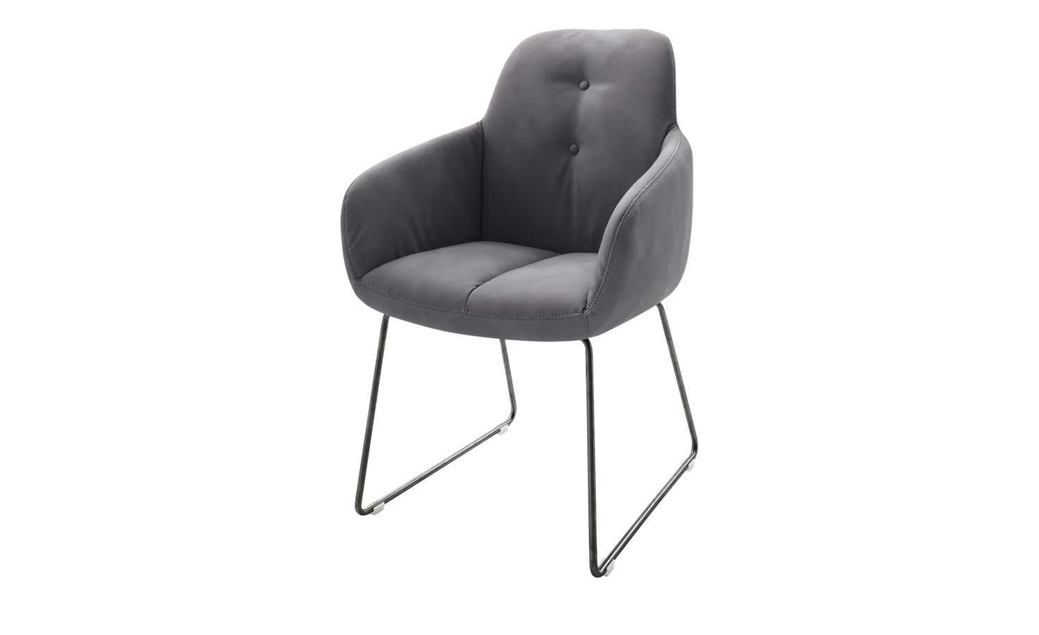 Sitzkomfort sollte auch bei Tisch selbstverständlich sein. Deshalb empfehlen wir den Kufenstuhl Sema. Sitzfläche, Rücken und Armlehnen sind dick mit Schaumstoff gepolstert. Die Rücklehne hat eine angenehme Höhe, die Armlehnen sind leicht schräg geformt, so dass Sie die Arme noch bequemer abstützen können. Die komplette Sitzschale ist mit Mikrofaser bezogen. Sie fühlt sich etwas samtig an und hat eine leichte Oberflächenstruktur. Auf der Vorderseite des Stuhlrückens befinden sich zwei dekorative Zierknöpfe; die Sitzfläche ist abgesteppt. Für einen guten Stand sorgt das Stuhlgestell, das aus zwei Metallkufen besteht.