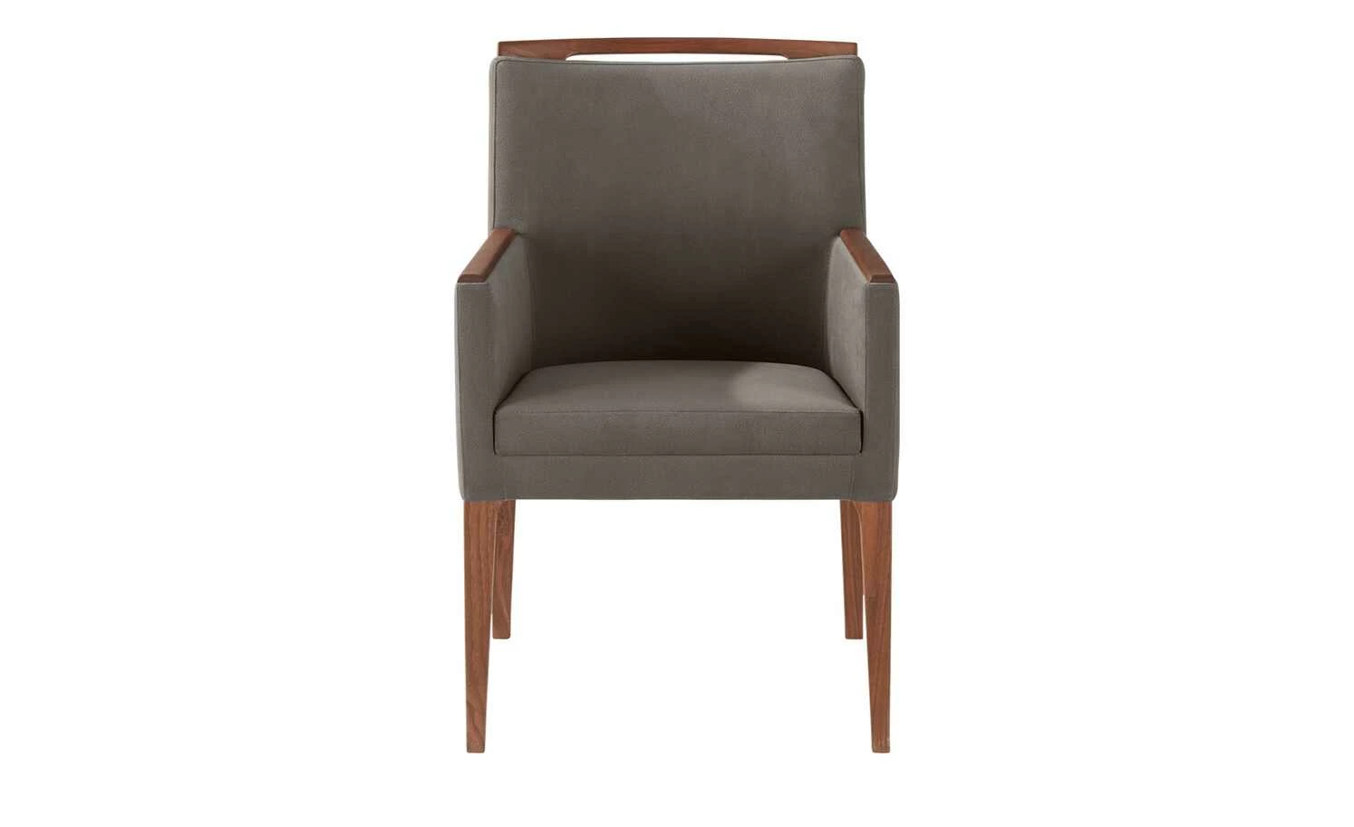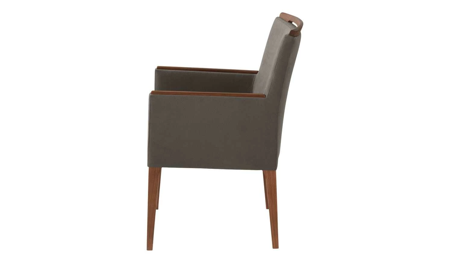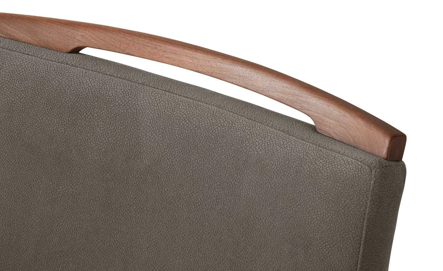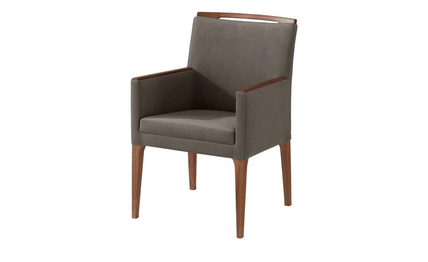 In Optik und Komfort erinnert der Stuhl Botho an einen Sessel. Er ist von der Marke Wohnwert und stabil verarbeitet. Botho verfügt über Armlehnen in einer angenehmen Höhe. Sie sind oben mit sogenannten Chateausen ausgestattet. Dabei handelt es sich um die Holzabsetzungen in Nussbaum. Am oberen Ende der Rückenlehne ist ein Griff designt, der praktisch ist und sich dekorativ in die Gesamtoptik einfügt. Er besteht – ebenso wie Gestell und Armlehnen – aus massivem Nussbaum. Das dunkle Holz harmoniert mit dem Mikrofaserbezug.
