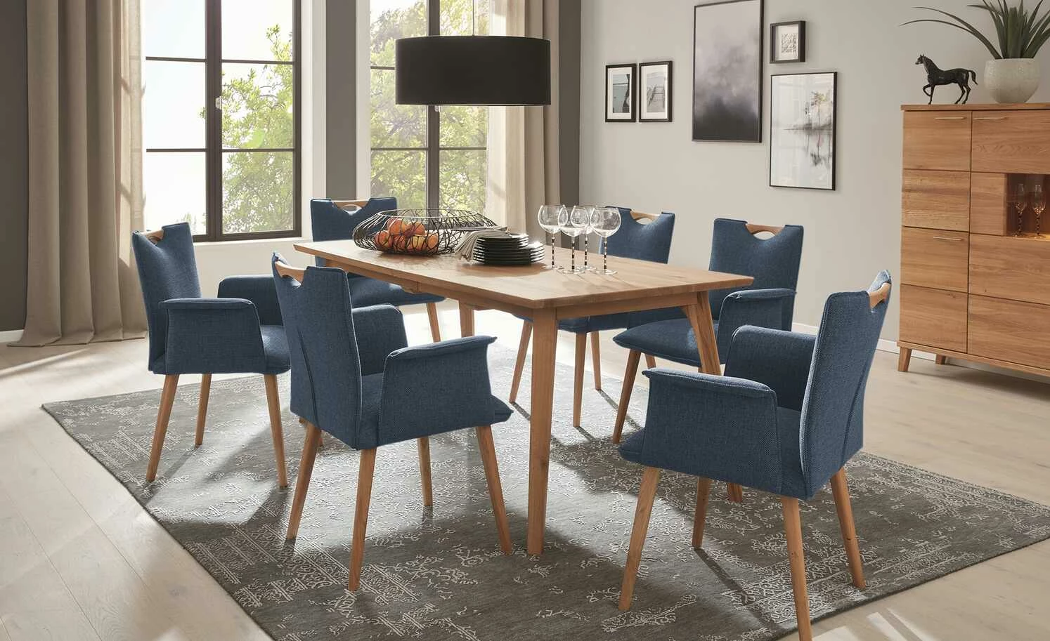 Der Stuhl Scandio von Wohnwert setzt auf exklusives Design. Es hat eine dezente skandinavische Note, die dem Stuhl auch seinen Namen verleiht. Rücken, Sitz und die geschwungenen Armlehnen sind mit einem Webstoff bezogen. Er hat eine griffige, strukturierte Oberfläche und ist meliert. Dank der dicken Polsterung unterhalb des Stoffes sitzen Sie bequem. Am oberen Ende der Lehne befindet sich ein praktischer Griff. Er ist – passend zum Gestell – aus massiver Wildeiche gefertigt und ebenfalls geölt.